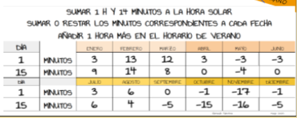 • Sumar el tiempo relativo al desplazamiento de nuestro lugar con respecto a el Meridiano 0 o de Greenwich, (en España pasa a la altura de Huesca). Teniendo en cuenta que cada 15º serían 1 hora, si nuestra longitud es de 3,3º entonces hay que añadir 14 minutos.