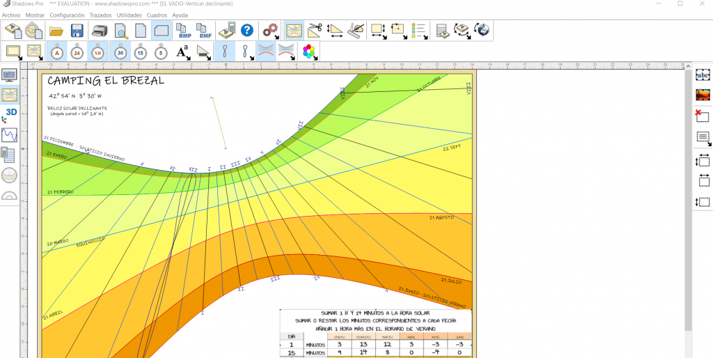 Para trazar las líneas de este reloj hemos utilizado el programa SHADOWS, de licencia gratuita para la mayoría de sus herramientas.