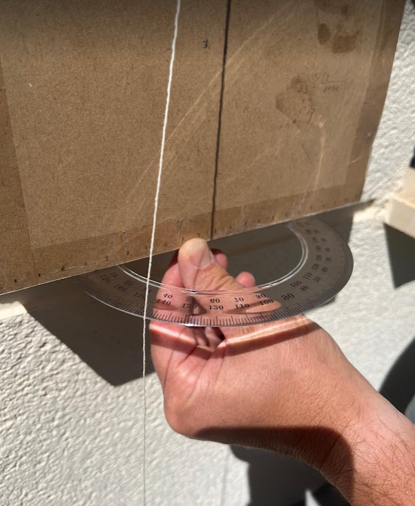 Lo que sí tienes que hacer, es medir la declinación de la pared, es decir , el ángulo que se separa del sur hacia el este o hacia el oeste a la hora del mediodía del lugar. utilizando como se ve en la imagen una plomada y un transportador de ángulos. se toma la medida cuando la sombra de la plomada pasa por el centro.