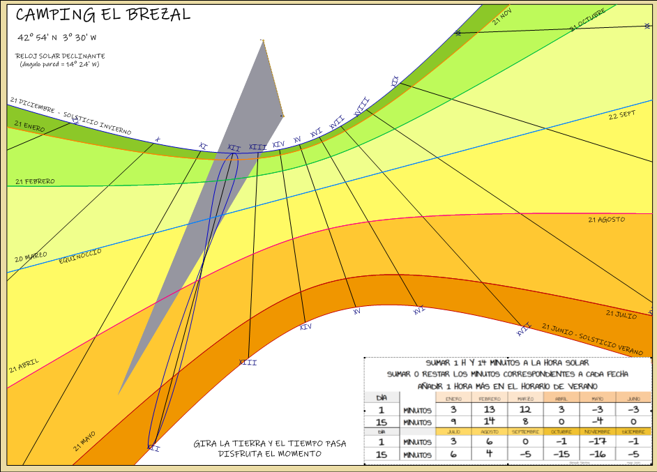 • y por último sumar o restar los minutos de una cosa muy chula que se llama la Ecuación de Tiempo, porque el día solar verdadero no es constante debido a la velocidad de traslación de la Tierra. (para quien quiera saber más aquí el enlace a la wikipedia).