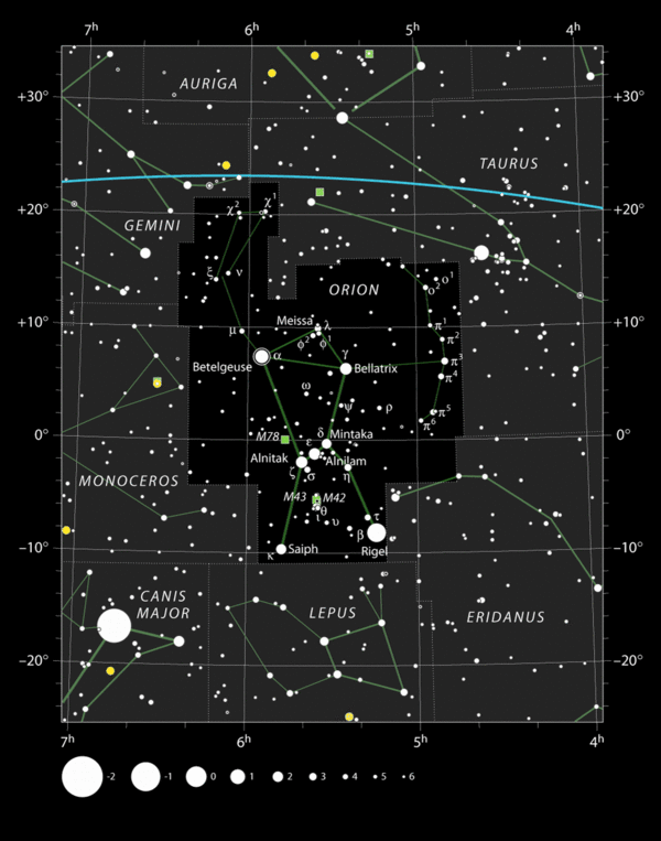 La túnica está delimitada por 4 estrellas de gran magnitud, de las cuales destacan la gigante roja Betelgueuse, fácilmente distinguible, incluso su color rojizo, en el hombro izquierdo, visto desde el hemisferio norte.